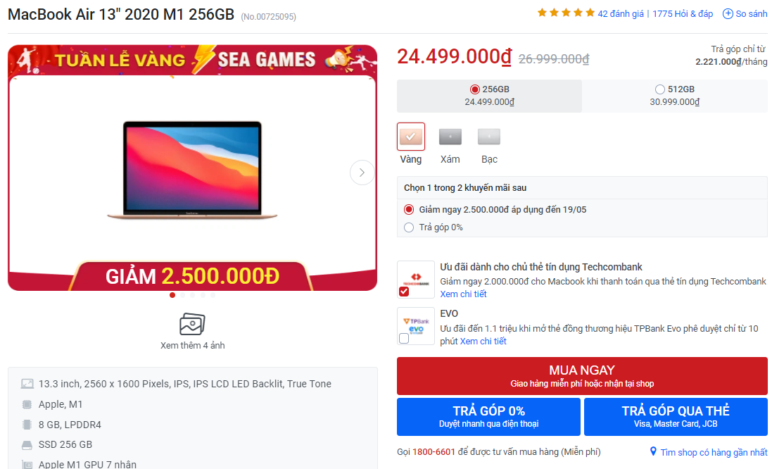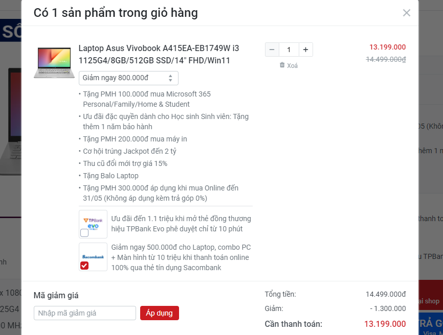 Bước 2: Nhấn vào ô “Giảm ngay 500.000đ cho Laptop, PC, Màn hình từ 10 triệu khi thanh toán online 100% qua thẻ tín dụng Sacombank”