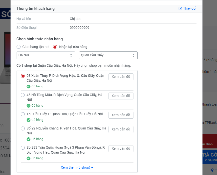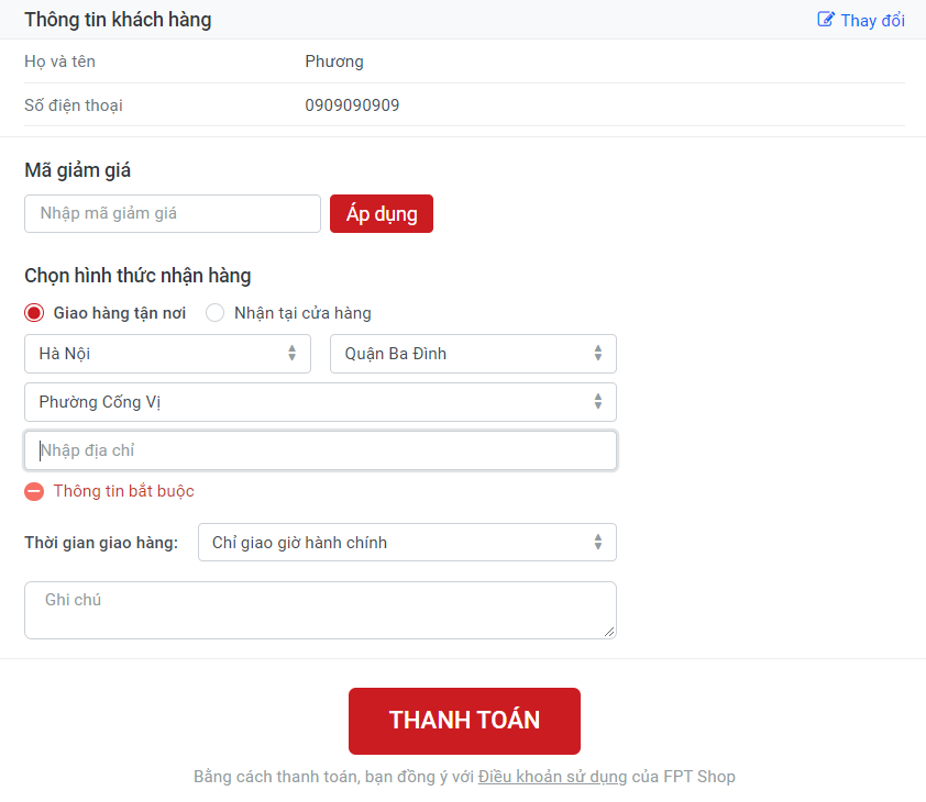 Bước 4: Khách hàng điền thông tin người mua và địa chỉ nhận hàng, sau đó nhấn “Thanh toán”