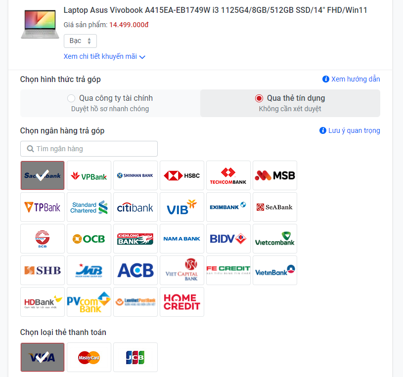 Bước 2: Chọn ngân hàng trả góp Sacombank và loại thẻ thanh toán