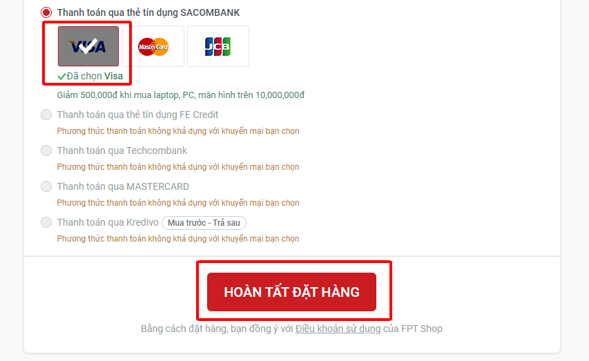 Bước 3: Điền thông tin cá nhân, chọn hình thức thanh toán qua thẻ tín dụng Sacombank và nhấn “Hoàn tất đặt hàng”