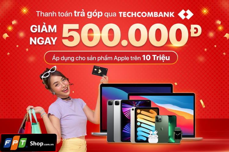 Từ ngày 05 - 31/5, chọn mua sản phẩm Apple có giá trị trên 10.000.000 đồng và thanh toán trả góp qua thẻ tín dụng Techcombank tại website FPT Shop, khách hàng sẽ được giảm ngay 500.000 đồng.