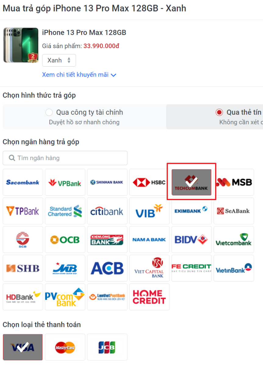 Bước 2: Chọn ngân hàng trả góp là Techcombank và loại thẻ thanh toán.