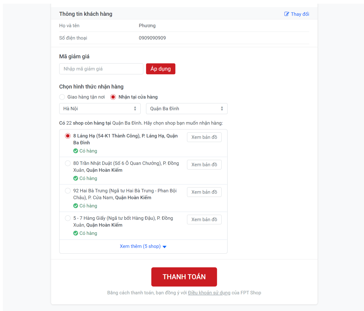Bước 4: Khách hàng điền thông tin người mua và địa chỉ cửa hàng gần nhất, sau đó bấm “Thanh toán".