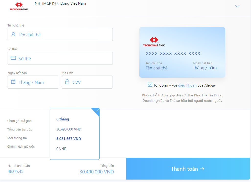 Bước 5: Điền thông tin thẻ và chọn “Thanh toán" để hoàn tất giao dịch.