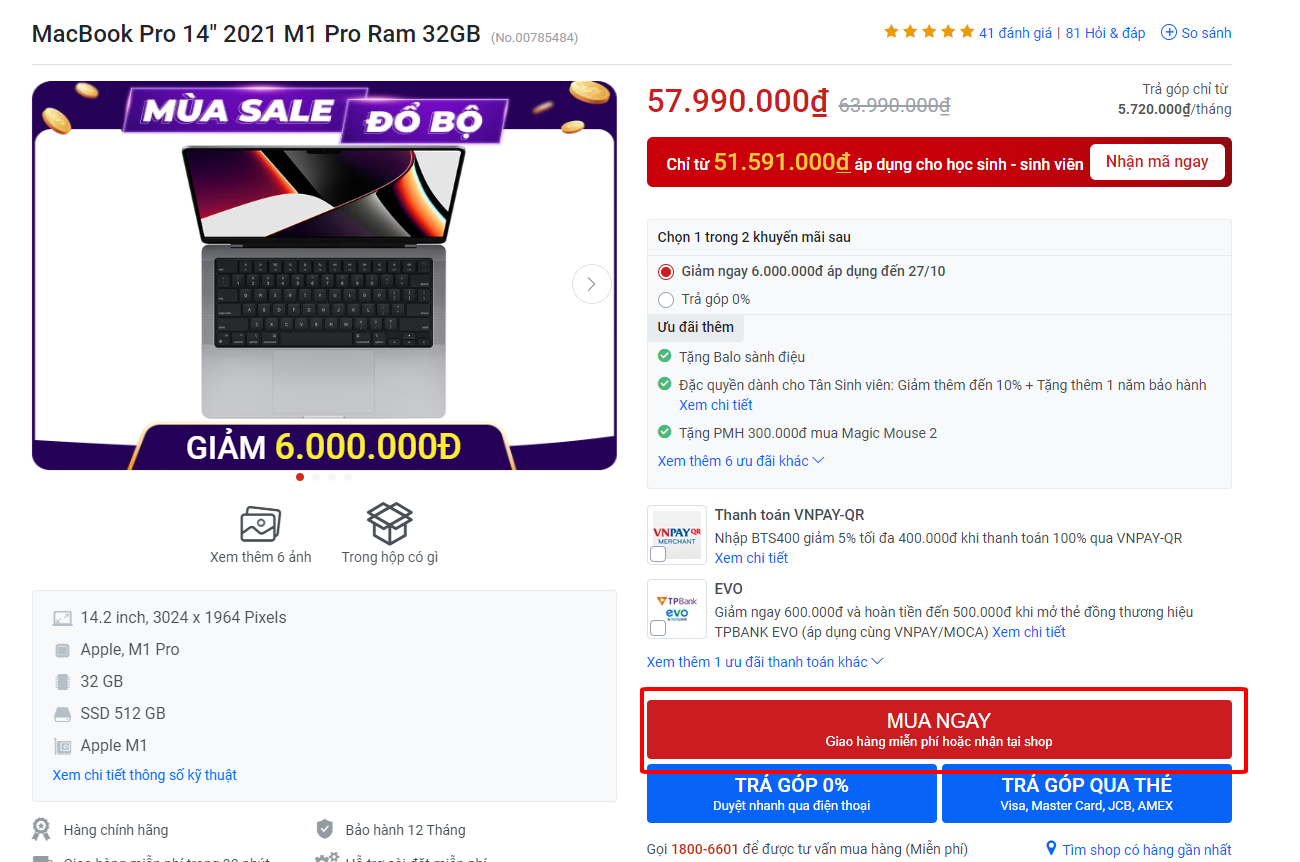 Bước 1: Truy cập vào trang website của FPT Shop, chọn sản phẩm laptop, PC, Macbook, iPad vào ô tìm kiếm. Nhấp chọn “Mua ngay