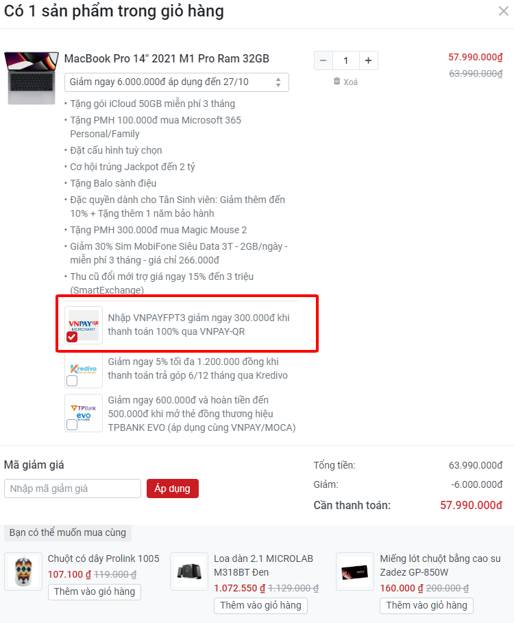 - Nhận thông báo Mã khuyến mại VNPAYFPT3 hiển thị pop up
