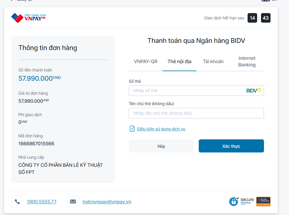 Nếu khách hàng chọn thanh toán qua thẻ nội địa và tài khoản ngân hàng: Khách hàng điền thông tin cá nhân theo yêu cầu