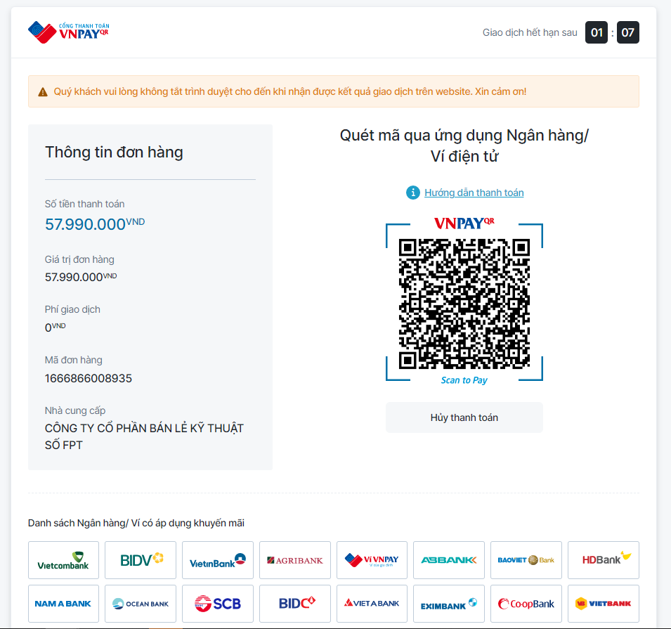 Nếu khách hàng chọn thanh toán qua mã QR - Code: