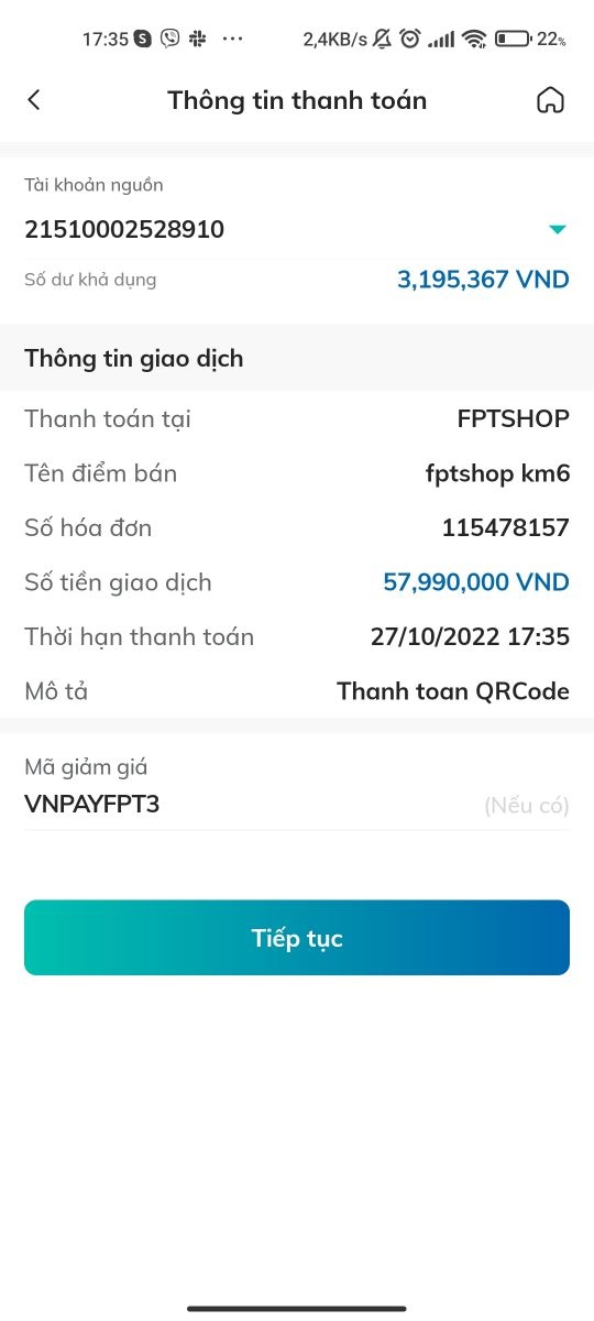 Đăng nhập vào ứng dụng Mobile Banking của ngân hàng, chọn tính năng QR Pay. Quét mã QR và nhập trên Mobile Banking mã ưu đãi VNPAYFPT3 (nếu thanh toán trên web) vào ô “Mã giảm giá”.
