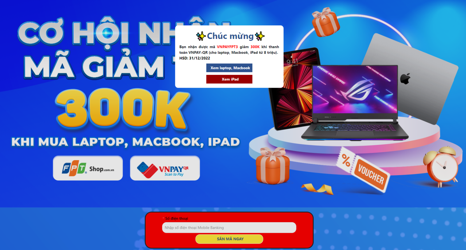 Theo đó, từ ngày 01/12 - 31/12/2022, khách hàng chọn mua laptop, PC, Macbook, iPad (Áp dụng cho sản phẩm trên 8.000.000 đồng) và thanh toán 100% qua VNPAY-QR sẽ được giảm 300.000 đồng tại FPT Shop.