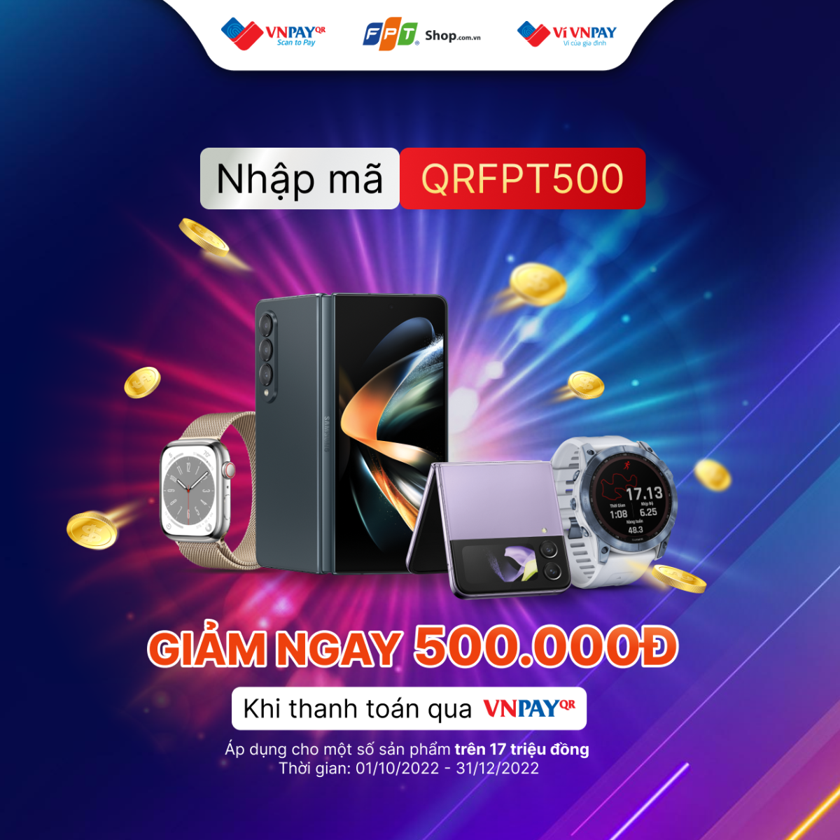 Từ nay đến ngày 31/12/2022, khách hàng mua sản phẩm tại FPT Shop và chọn thanh toán qua VNPAY-QR sẽ được giảm đến 500.000 đồng.