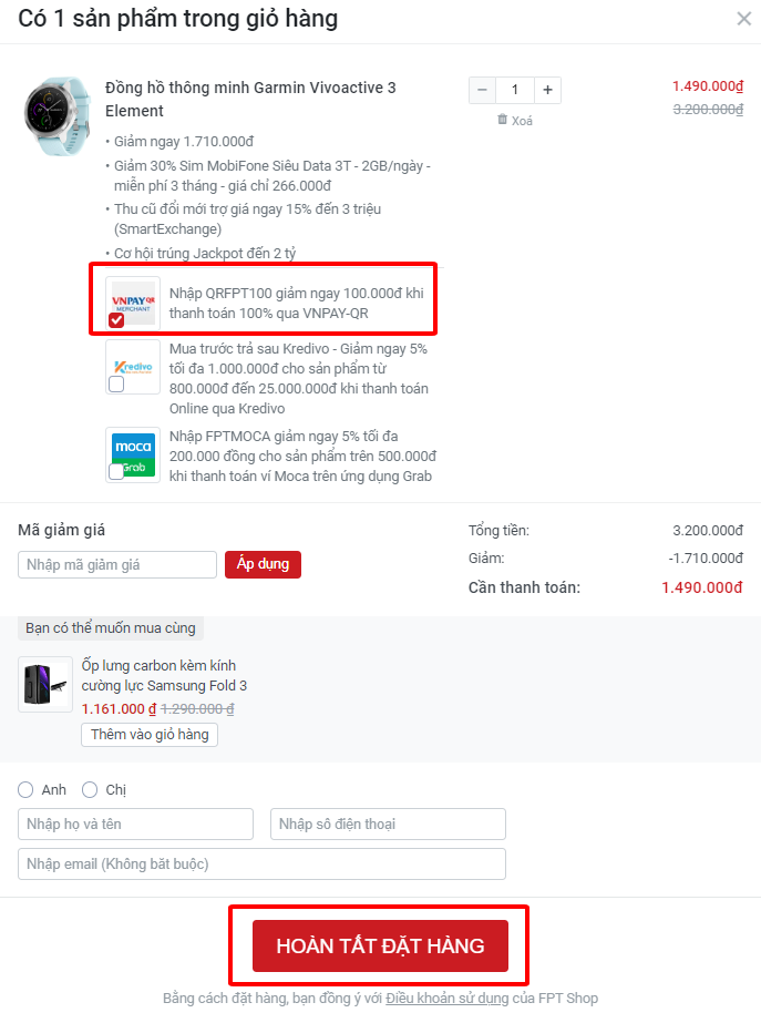 Bước 2: Bấm chọn ô “Nhập QRFPT100 giảm ngay 100.000đ khi khách hàng thanh toán 100% giá trị đơn hàng”. Sau đó, bạn điền đầy đủ thông tin cá nhân, chọn hình thức nhận hàng và hình thức thanh toán bằng “ATM nội địa/ QR CODE/ Internet Banking (Thanh toán qua VNPAY). Bấm “Hoàn tất đặt hàng”.