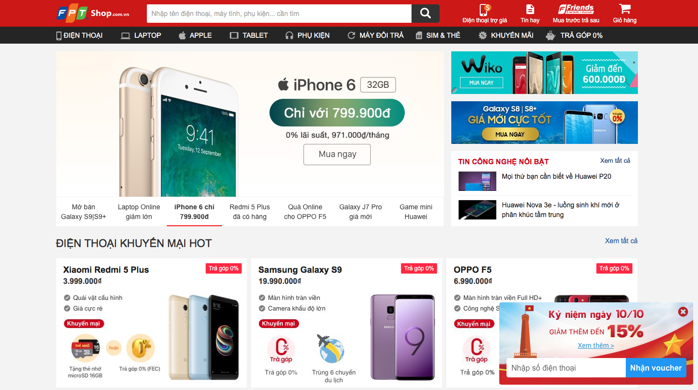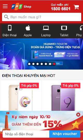 Từ 8/10 - 11/10, FPT Shop tung hàng trăm ngàn voucher giảm giá đến 15% cho tất cả sản phẩm điện thoại, laptop, máy tính bảng, Apple. Đây là cơ hội "có một không hai" để bạn "rinh" những sản phẩm chất lượng với giá cực ưu đãi.