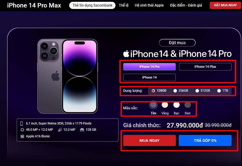 Bước 3: Chọn sản phẩm (model, dung lượng, màu sắc) và nhấn nút “Mua ngay”/ “Trả góp 0%”
