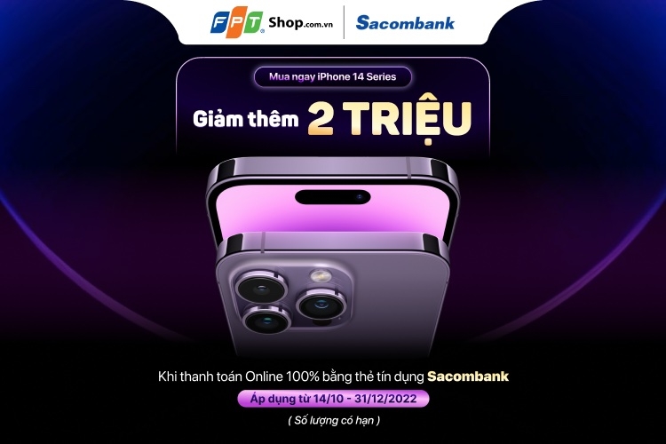 Theo đó, từ nay đến hết 31/12/2022, khi mua iPhone 14 Series tại FPT Shop và chọn thanh toán bằng thẻ tín dụng Sacombank, bạn được giảm thêm 2.000.000 đồng.