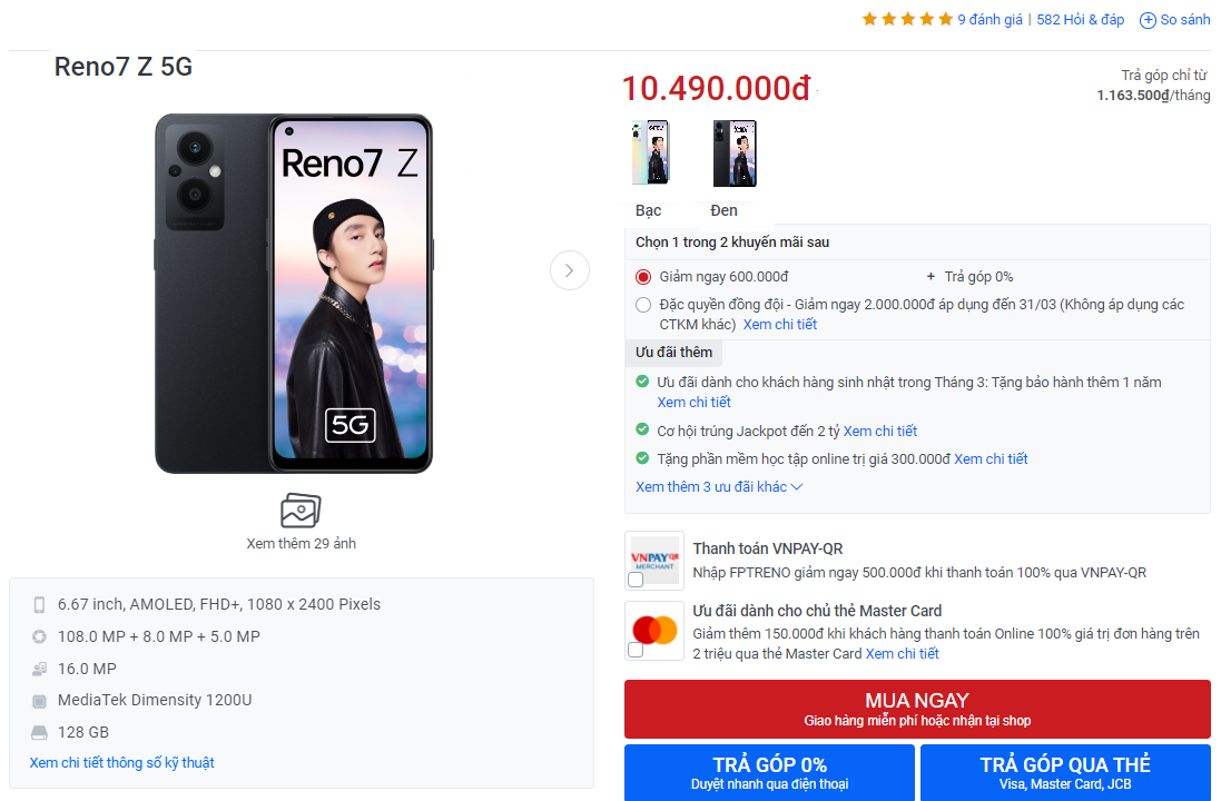 Theo đó, từ ngày 26/03 - 30/4, khi khách hàng mua Oppo Reno7 Series và thanh toán trả thẳng 100% giá trị đơn hàng qua VNPAY-QR tại FPT Shop, bạn sẽ được giảm ngay 500.000 đồng.