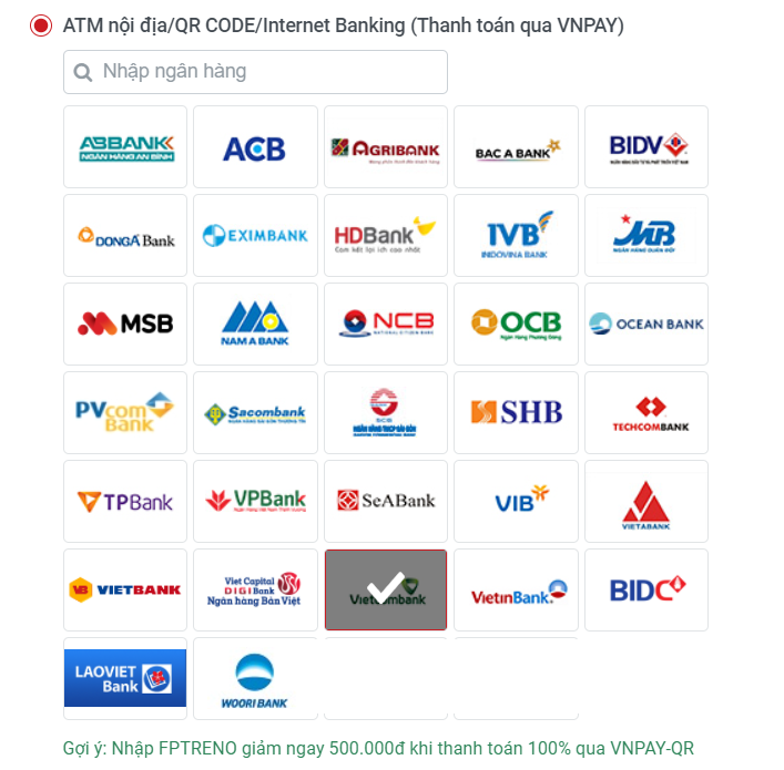 - Cách 2: Chọn logo ngân hàng, khách hàng sẽ được tự động chuyển sang ứng dụng Mobile Banking. Đăng nhập ứng dụng và nhập mã FPTRENO vào ô “Mã giảm giá”