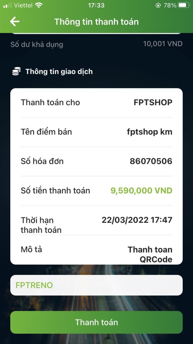 Đăng nhập vào ứng dụng Mobile Banking của ngân hàng, chọn tính năng QR Pay. Quét mã QR và nhập trên Mobile Banking mã ưu đãi FPTRENO (nếu thanh toán trên web) vào ô “Mã giảm giá”.