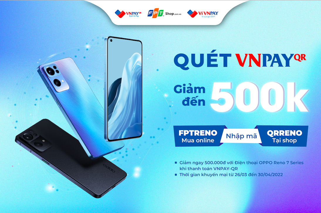 Giảm ngay 500.000 đồng cho khách hàng mua Oppo Reno7 Series thanh toán qua VNPAY-QR tại FPT Shop từ 26/03 đến 30/4/2022.