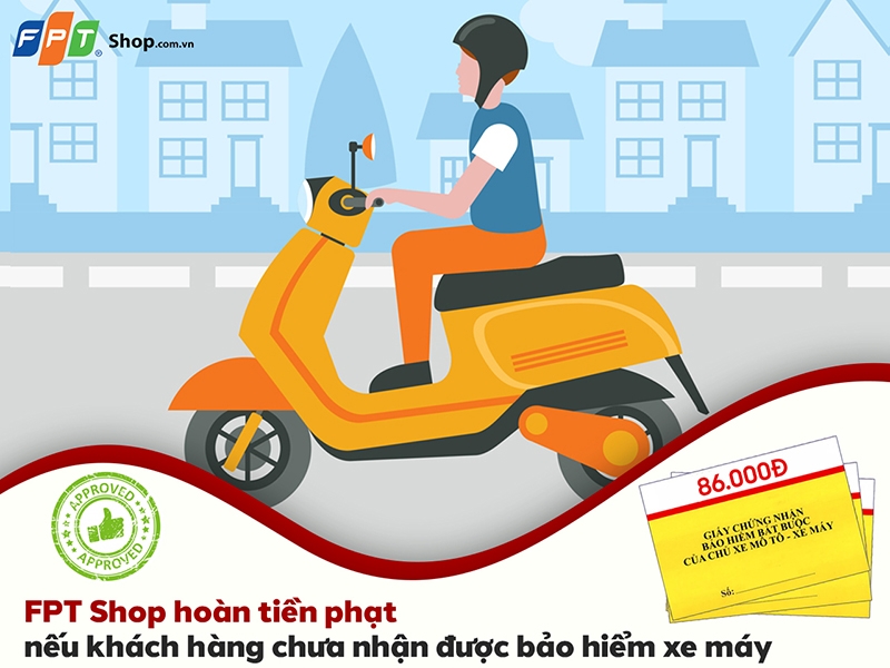 Từ nay, chọn mua bảo hiểm xe máy tại FPT Shop, khách hàng sẽ được bồi hoàn 100% phí phạt nếu bị phạt vì chưa nhận được bảo hiểm xe máy trong thời gian 4 ngày làm việc kể từ ngày đăng kí.