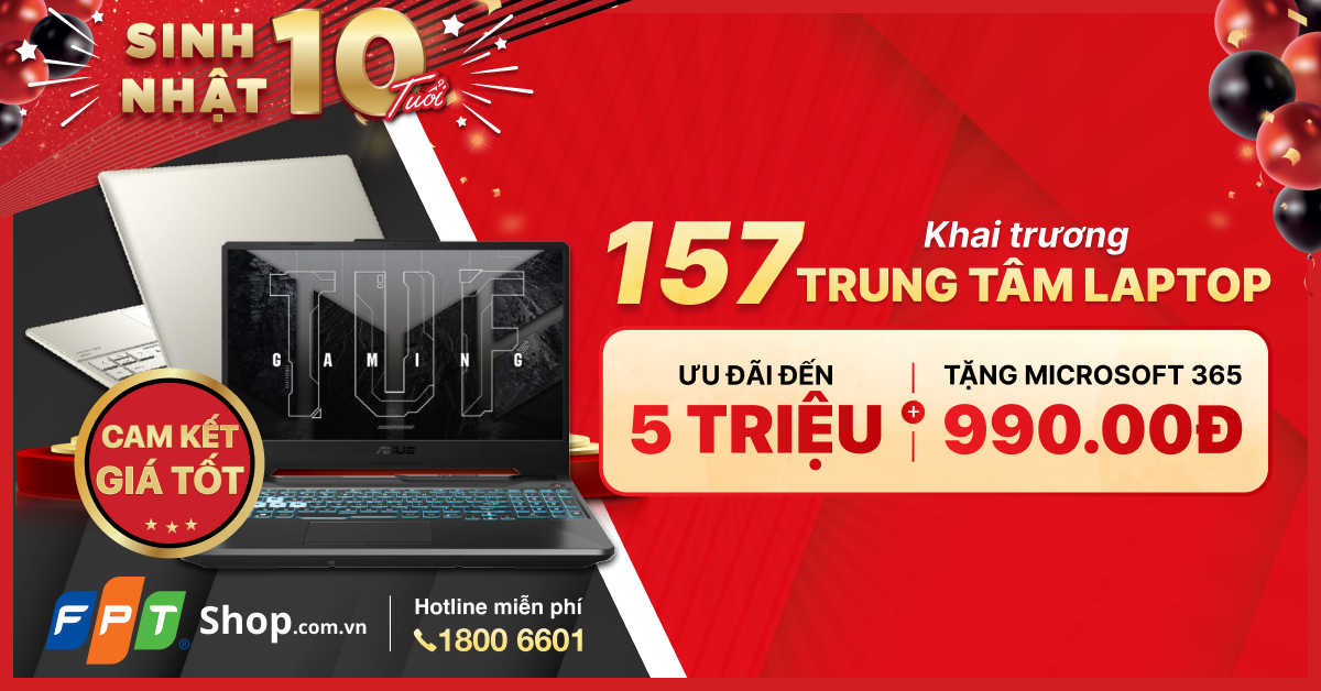 Kế thừa và phát triển thế mạnh về laptop của FPT Shop, 157 Trung tâm Laptop đều được xây dựng thành những cửa hàng chuyên biệt, tập trung bày bán đa dạng các sản phẩm laptop và nhiều phụ kiện có liên quan. Nhân dịp này, FPT Shop tung ưu đãi hấp dẫn từ ngày 18 - 31/03: giảm giá đến 5.000.000 đồng, laptop có giá ưu đãi chỉ còn từ 7.090.000 đồng, tặng thêm phần mềm Microsoft 365 chính hãng trị giá 990.000 đồng cho khách hàng chọn mua laptop tại Trung tâm laptop và thanh toán theo hình thức trả thẳng (áp dụng tuỳ sản phẩm).