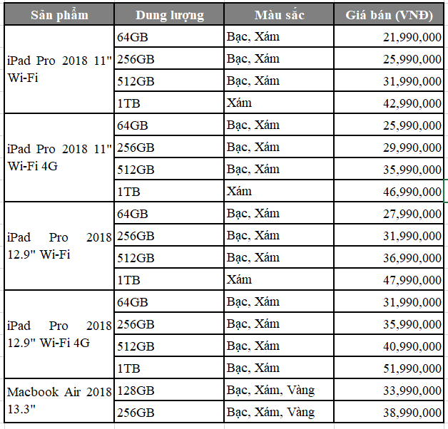 Được biết, các sản phẩm iPad Pro 11”, 12.9” và Macbook Air 13.3” 2018 chính hãng có thời gian lên kệ dự kiến vào ngày 15/12 tới. Giá bán, dung lượng và màu sắc của các sản phẩm được thể hiện cụ thể trong bảng sau: