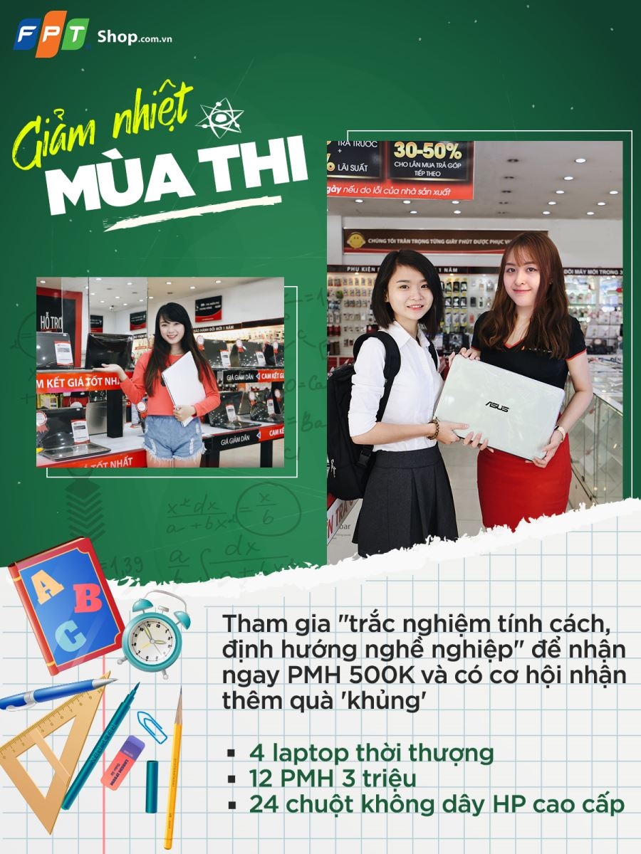 Từ ngày 1/6, FPT Shop sẽ tổ chức chương trình “Giảm nhiệt mùa thi” với những bài trắc nghiệm tính cách chọn nghề nghiệp cực kỳ bổ ích cho sĩ tử. Tham gia chương trình, bạn nhận ngay voucher 500.000 đồng và thêm cơ hội trúng 4 laptop cùng nhiều quà tặng giá trị.