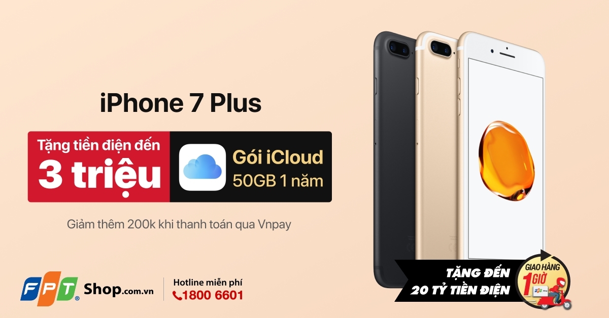 Chọn mua iPhone 7 Plus 32GB tại FPT Shop từ ngày 1 - 30/6, bạn được tặng ngay 50GB/năm iCloud miễn phí, mở rộng dung lượng lưu trữ lên 82GB. Ngoài ra, bạn còn được trả góp 0% lãi suất hoặc giảm ngay 2 triệu khi trả thẳng.