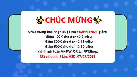 Từ nay đến ngày 07/07/2022, khi khách hàng mua hàng tại FPT Shop và chọn thanh toán bằng VNPAY-QR sẽ nhận được giảm giá đến 500.000 đồng.