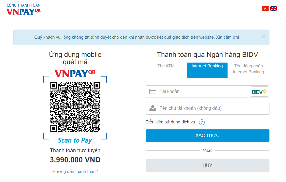(Trong một số trường hợp đã làm theo hai mục trên nhưng vẫn lỗi, bạn thử sử dụng máy tính hoặc dùng điện thoại khác để thanh toán)