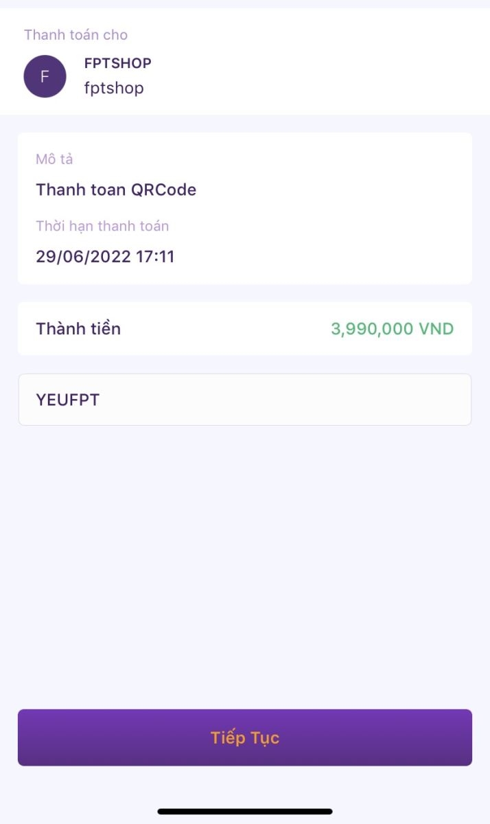 Đăng nhập vào ứng dụng Mobile Banking của ngân hàng, chọn tính năng QR Pay. Quét mã QR và nhập trên Mobile Banking mã ưu đãi YEUFPT (nếu thanh toán trên web) vào ô “Mã giảm giá”.