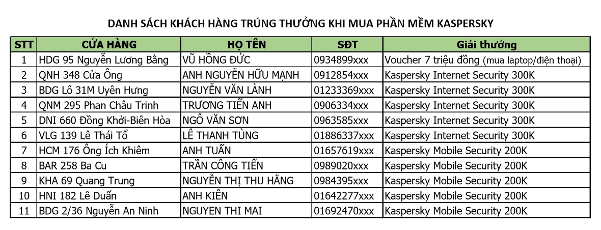 Danh sách khách hàng trúng thưởng đợt 1 (06/10 - 12/10):