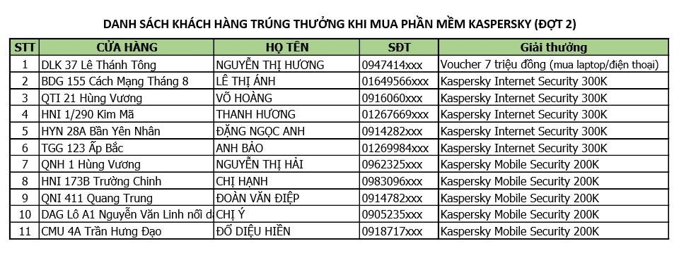 Danh sách khách hàng trúng thưởng đợt 2 (13/10 - 19/10):