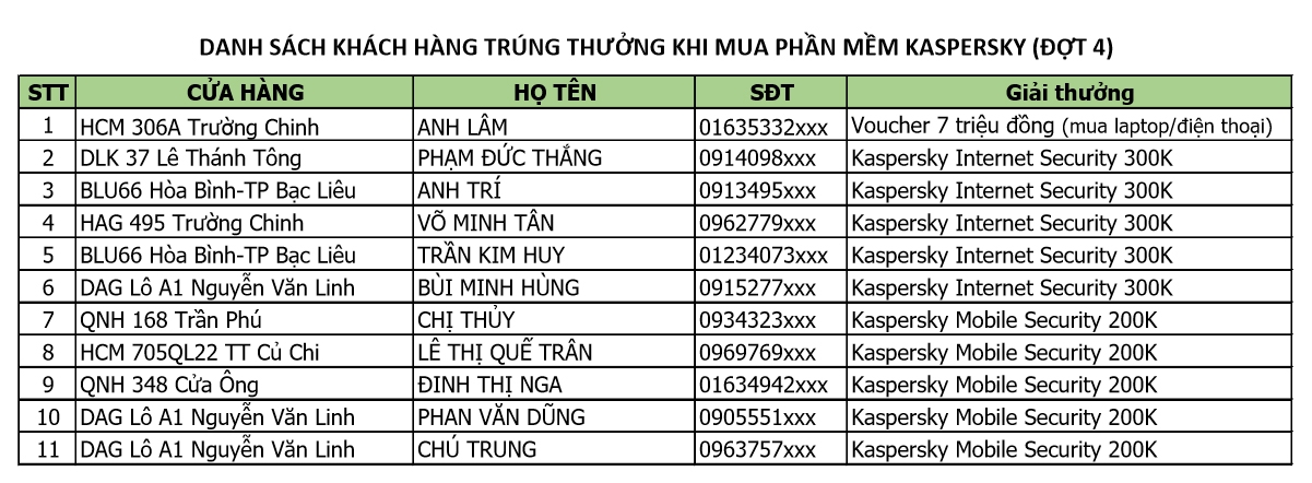 Danh sách khách hàng trúng thưởng đợt 4 (27/10 - 2/11):
