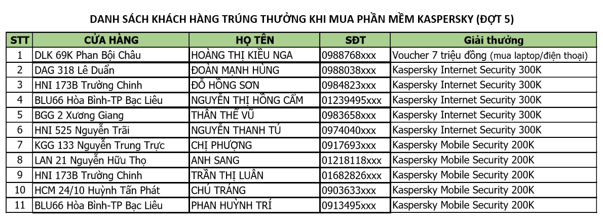 Danh sách khách hàng trúng thưởng đợt 5 (3/11 - 9/11):