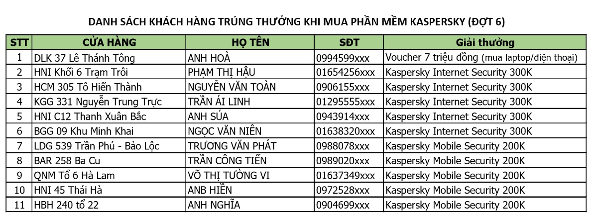 Danh sách khách hàng trúng thưởng đợt 6 (10/11 - 16/11):