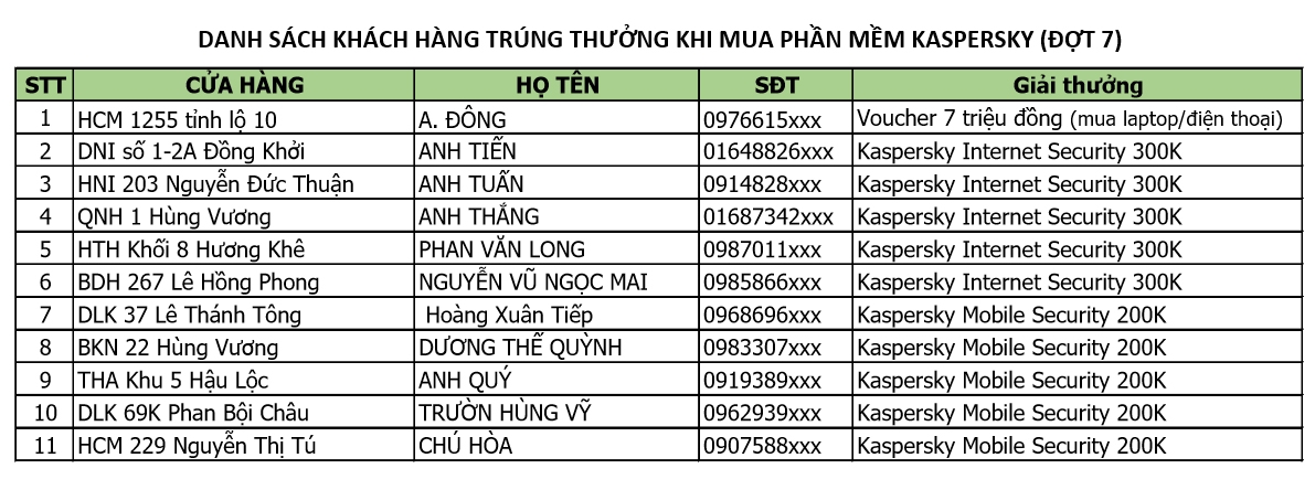 Danh sách khách hàng trúng thưởng đợt 7 (17/11 - 23/11):