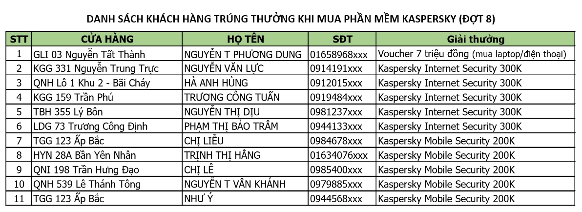 Danh sách khách hàng trúng thưởng đợt 8 (24/11 - 30/11):