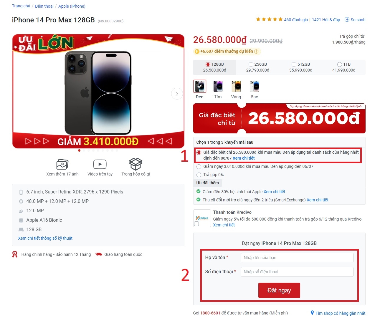 Chương trình iPhone 14 Pro Max Giá đặc biệt chỉ từ 26.580.000 đồng sẽ diễn ra từ 04/07 – 06/07. Để tham gia chương trình, bạn hãy lựa chọn Khuyến mãi Giá đặc biệt trong trang chi tiết sản phẩm, sau đó nhập thông tin vào box đăng ký và nhấn Đặt ngay.