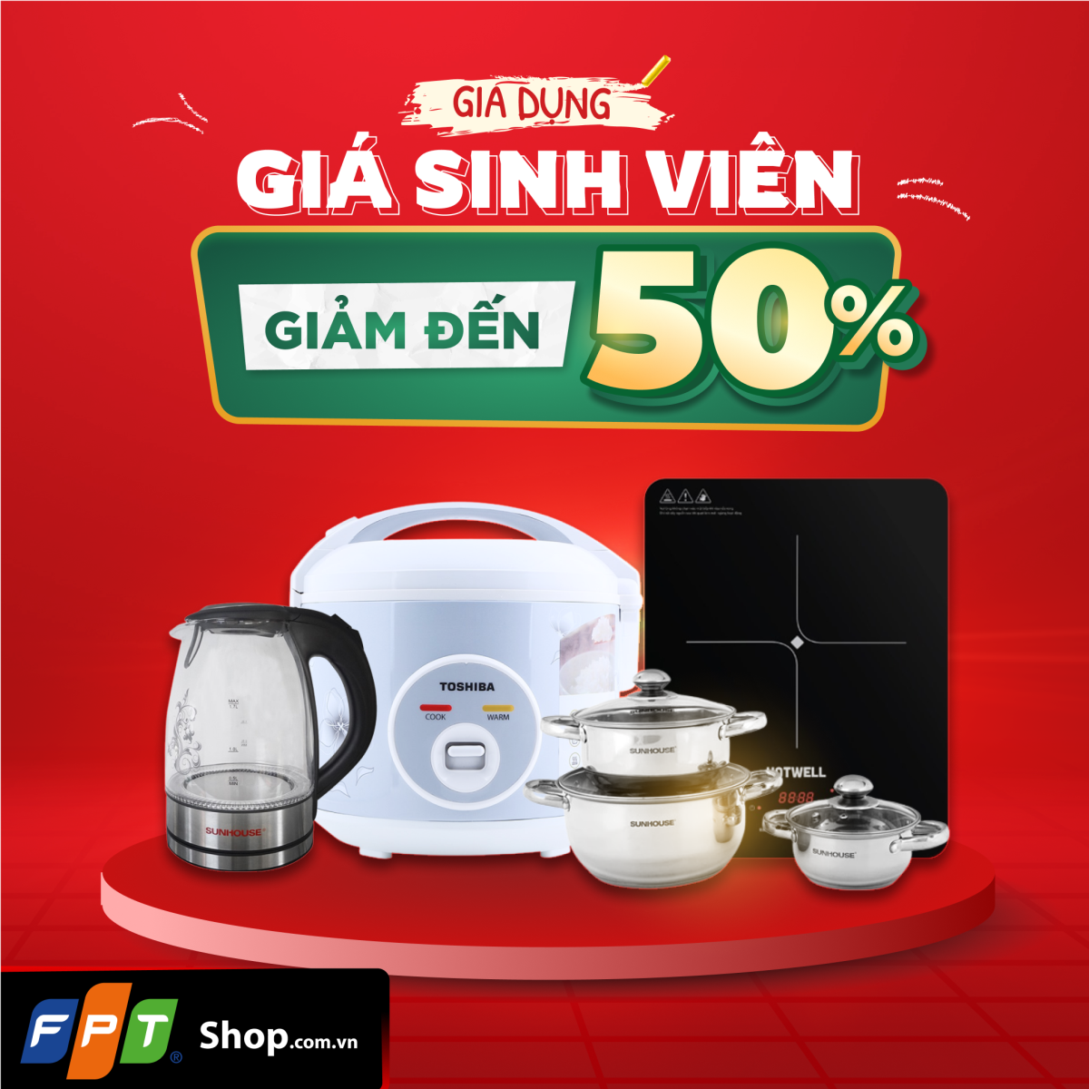 Từ ngày 01/07 – 31/10/2023, khách hàng là học sinh – sinh viên mua sản phẩm gia dụng tại FPT Shop sẽ được giảm đến 50%.