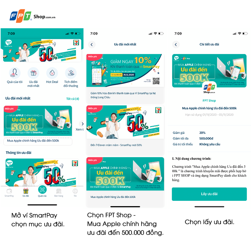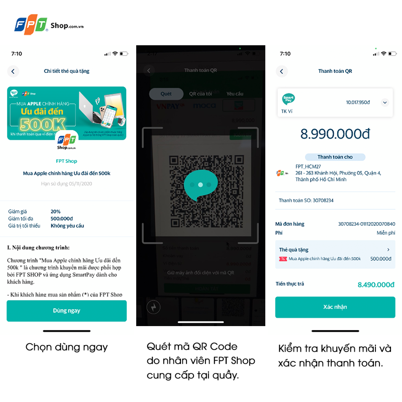Bước 3: Khách hàng mở ứng dụng SmartPay trên điện thoại, chọn mục Ưu đãi để lấy ưu đãi của FPT Shop - Mua Apple chính hãng ưu đãi đến 500.000 đồng sau đó chọn Lấy ưu đãi > Sử dụng ưu đãi > Dùng ngay và tiến hành Quét mã code QR thanh toán (Code QR nhân viên FPT Shop cung cấp ở bước 2).