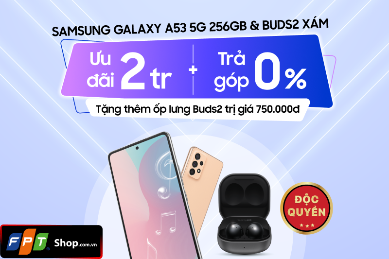 FPT Shop giảm ngay 2.000.000 đồng kèm ưu đãi trả góp 0% cho chủ nhân bộ đôi Galaxy Buds2 và Galaxy A53 5G 256GB.