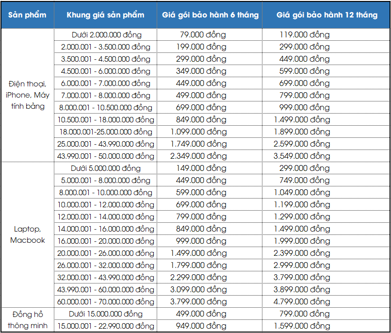 Thông tin chi tiết các gói ‘Bảo hành Vàng’ đều có trong bảng dưới đây: