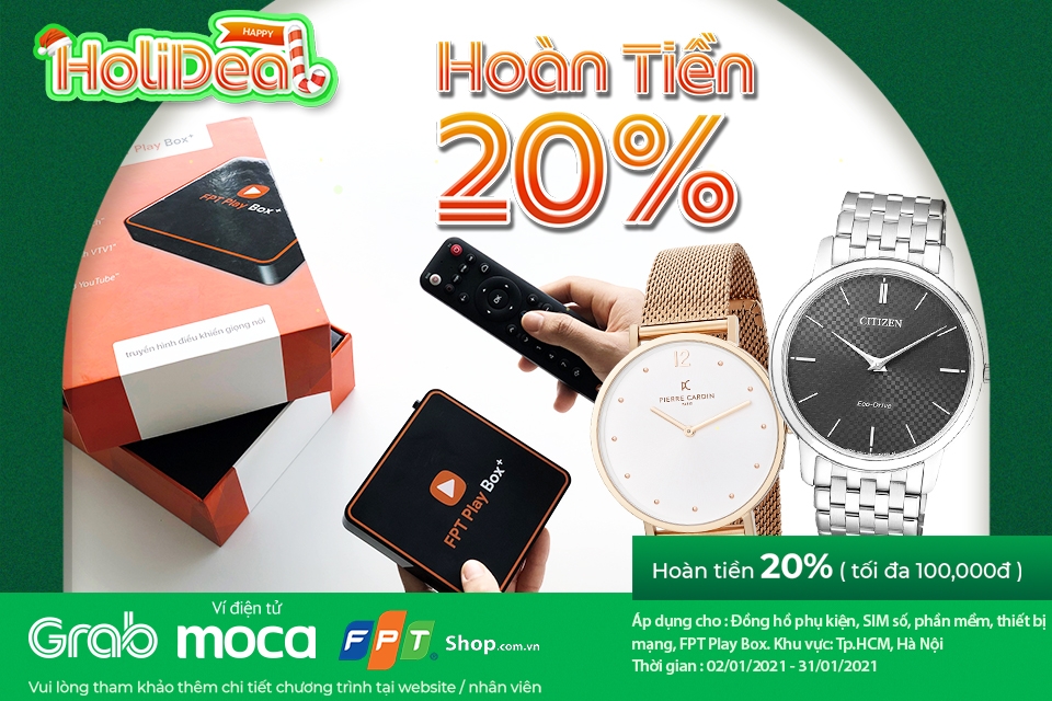 Từ hôm nay đến 31/01/2021, khi thanh toán hóa đơn các sản phẩm qua ví điện tử Moca bạn sẽ được hoàn tiền tối đa 100.000 đồng. Theo đó, mỗi tài khoản khi chọn mua sản phẩm tại FPT Shop và thanh toán bằng ví Moca trên ứng dụng Grab bạn sẽ được hoàn tiền ngay 20%, tối đa 100.000 đồng.