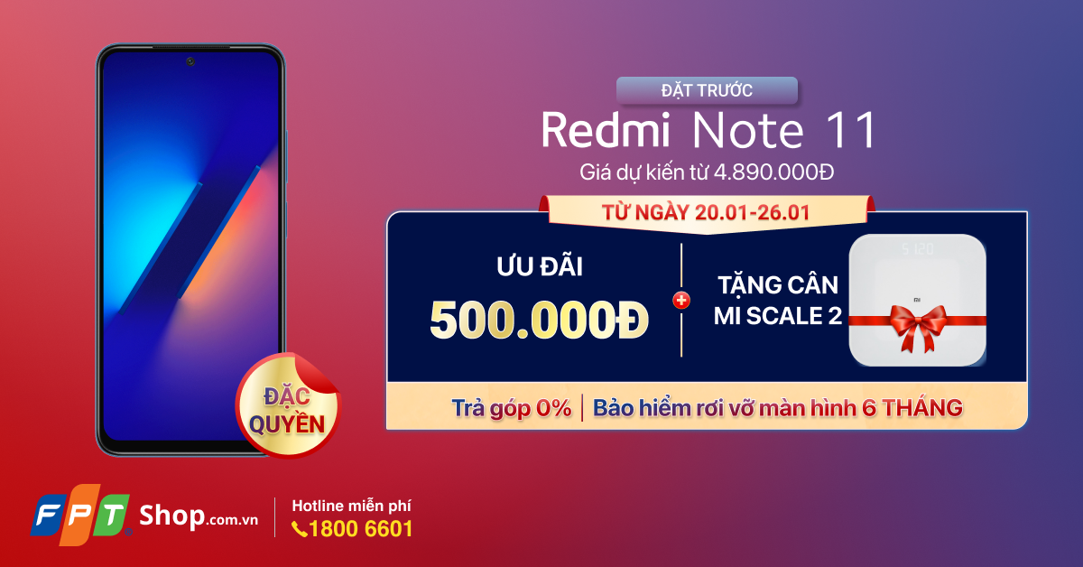 Để đặt trước Redmi Note 11 với nhiều ưu đãi nhất từ FPT Shop, bạn chỉ cần đặt cọc trước 300.000 đồng. Khách hàng có thể đến trực tiếp cửa hàng FPT Shop hoặc gọi điện thoại đến tổng đài miễn phí cước 1800 6601 để được hỗ trợ nhanh nhất.