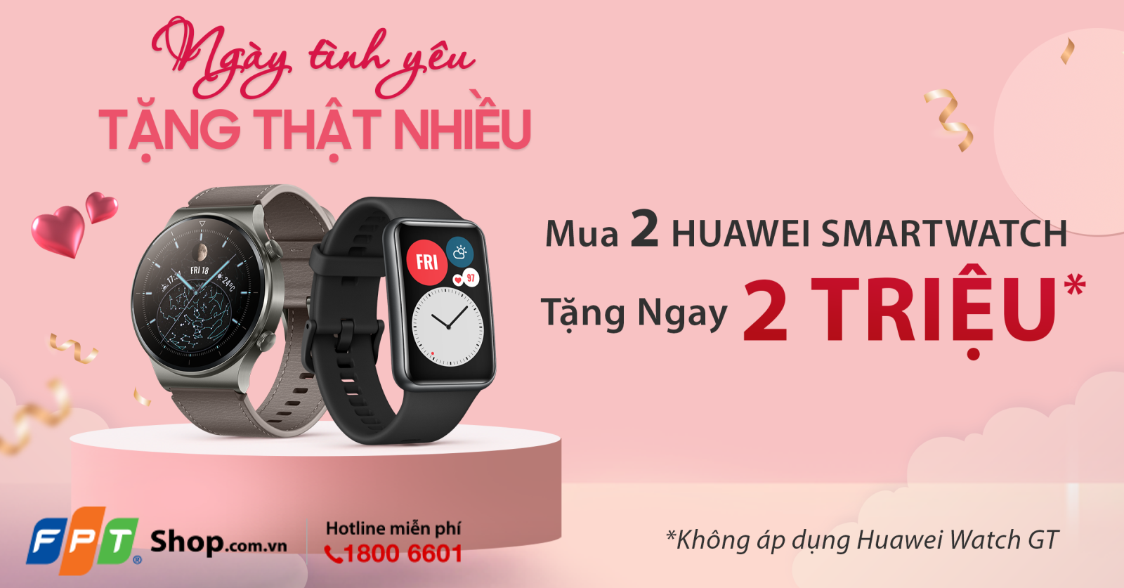 Nhân ngày lễ tình nhân 14/02, FPT Shop giảm ngay 2.000.000 đồng cho khách hàng mua 2 đồng hồ thông minh Huawei từ nay - 16/02.