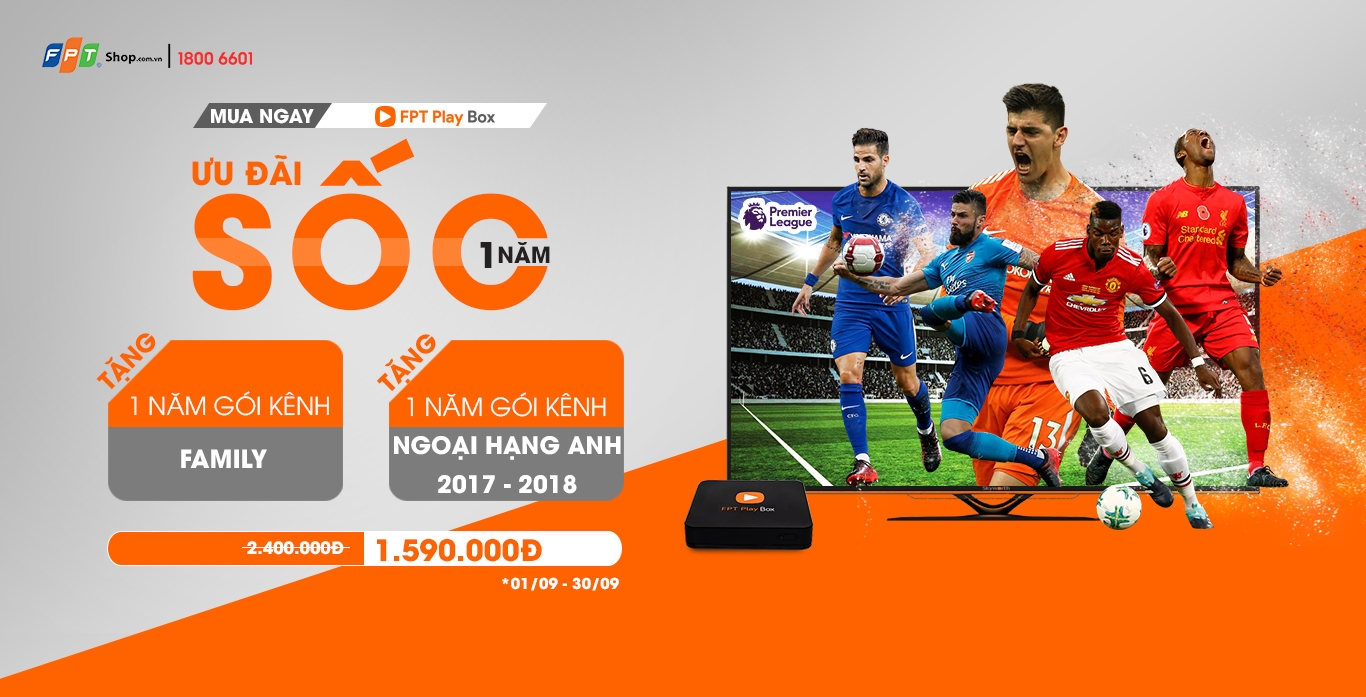 Chọn mua FPT Play Box tại FPT Shop trong tháng 9 này, bạn được giảm ngay 810.000 đồng, giá mới chỉ còn 1.590.000 đồng. Đặc biệt, FPT Shop còn tặng bạn thêm bản quyền giải Ngoại hạng Anh mùa giải 2017 - 2018 với những trần cầu siêu kinh điển.
