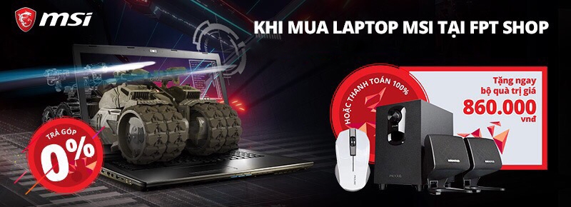 - Chọn mua các sản phẩm thuộc dòng laptop gaming MSI, bạn được tặng ngay combo quà bao gồm: loa Microlab 2.1 M108U trị giá 599.000 đồng và chuột không dây Prolink C6601 trị giá 299.000 đồng.