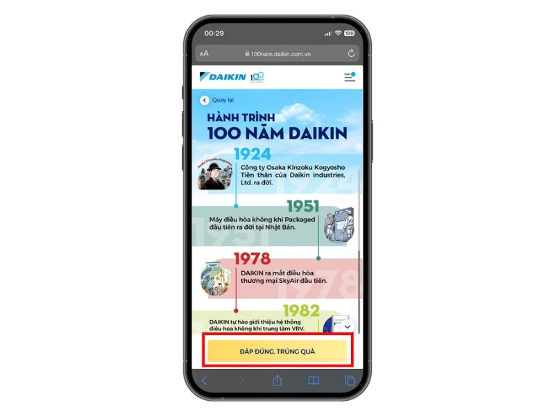 Bước 2: Tìm hiểu “Hành trình 100 của Daikin” và thông tin liên quan đến các dòng sản phẩm của thương hiệu Daikin, sau đó chọn “Đáp đúng, trúng quà”