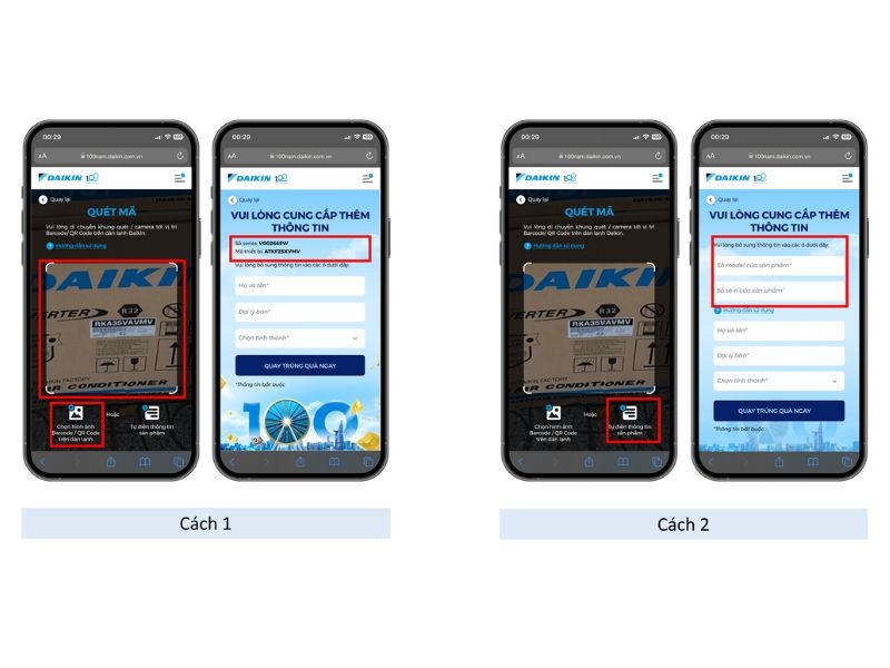 Bước 4: Khách hàng xác thực thông tin đã mua hàng và đủ điều kiện tham gia vòng quay bằng cách cung cấp Mã hiệu và Số seri của sản phẩm. Để thực hiện, khách hàng có thể chọn 1 trong 2 cách thực hiện như sau: